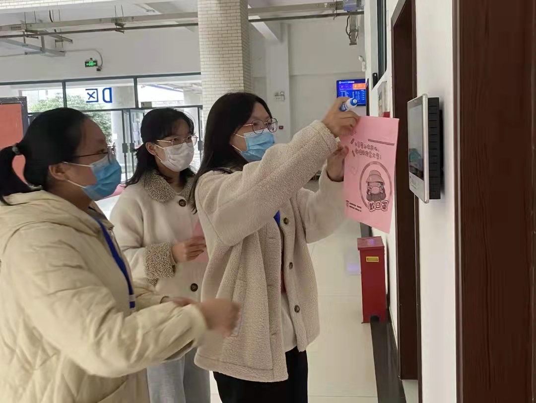 利用课余时间,宣传组的队员们还发挥自身特长,在队长们的带领下紧锣密鼓地为疫情防控宣传工作制作宣传标语、印制疫情防控倡议书,并深入到各个班级、宿舍为同学们发放,引导班级学生干部组织疫情防控教育活动;在学院办公室、固定教室等场所一一张贴“口罩戴上你我他,疫情防控靠大家”宣传标语及倡议书,旨在增强师生疫情防控意识,引导全员积极配合各级部门的疫情防控工作。