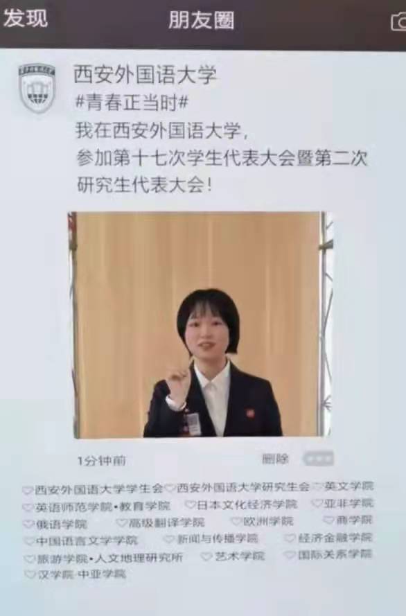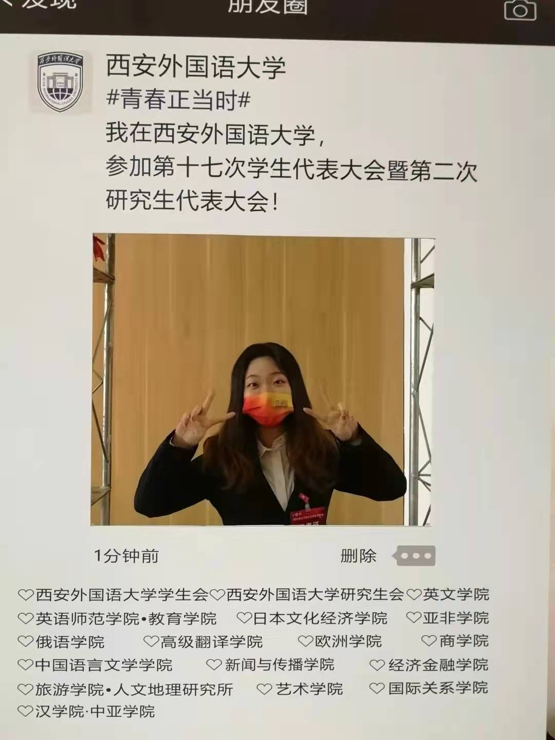本次大会中,作为参会学生代表,我听取了校学生会过往的工作报告,感受到了他们作为党领导下的学生组织坚决落实各项改革要求的决心,和坚定为同学们服务的真心。对我自己而言,参与此次大会也更坚定了我切实服务同学的工作信念,我将继续以西外学子的身份勇担时代重任,贡献青春力量。