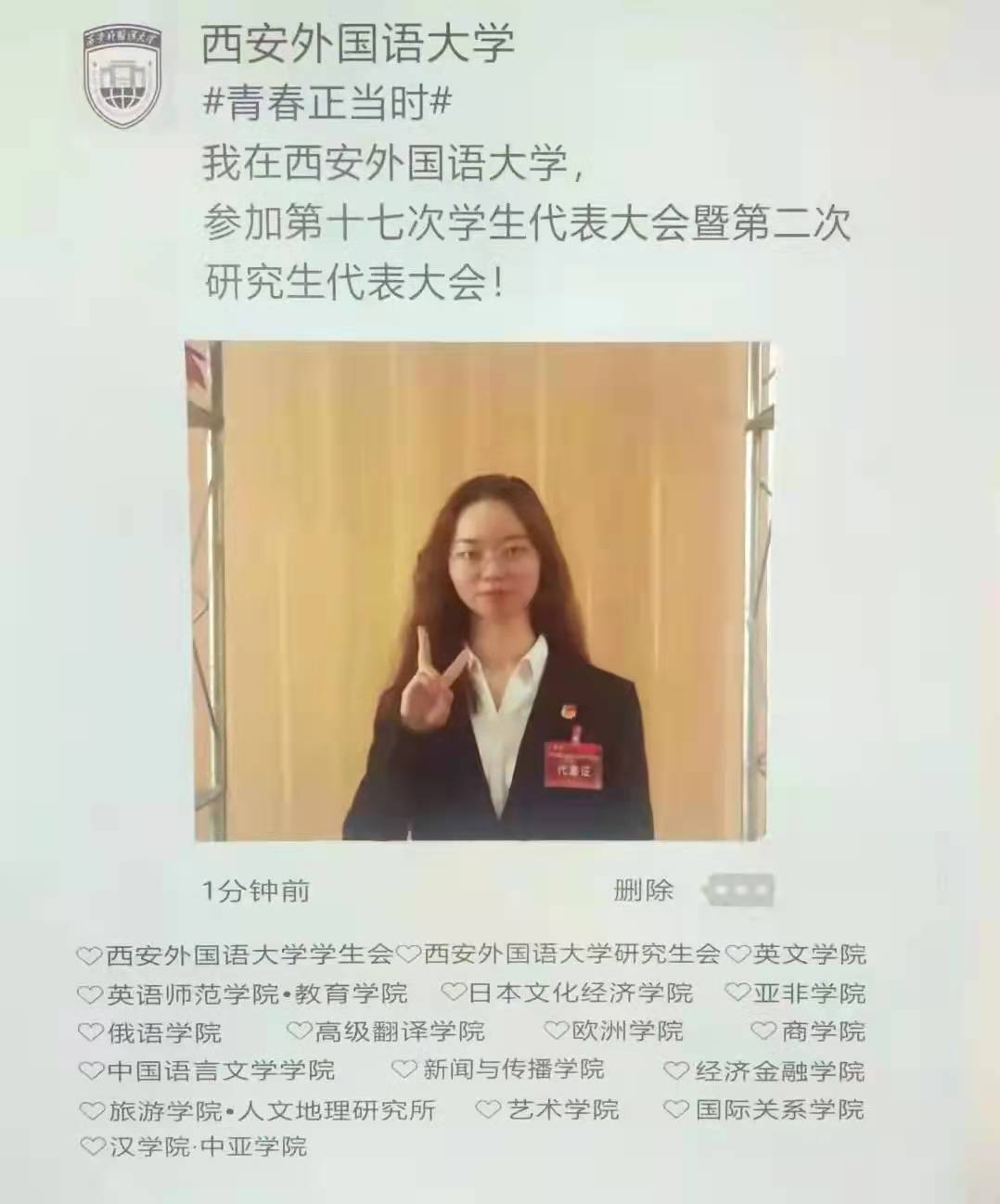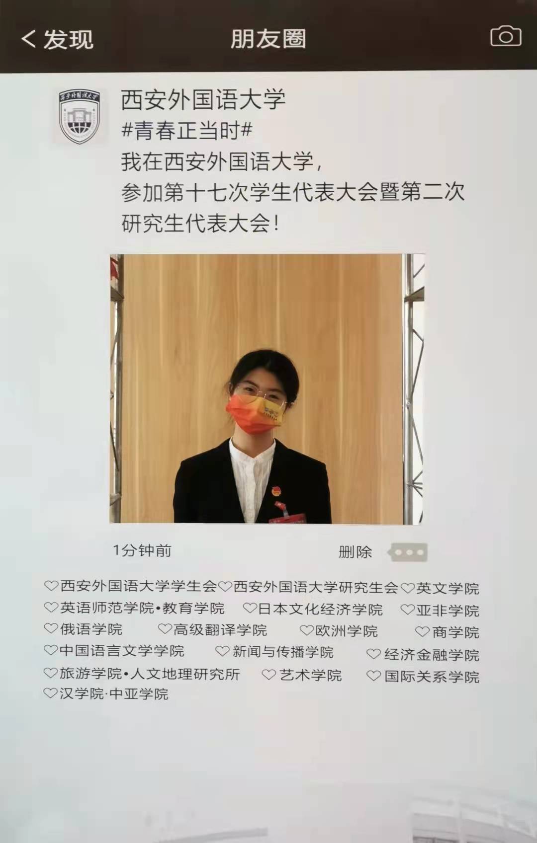 青年是整个社会力量中最积极、最有生气的力量,国家的希望在青年,民族的未来在青年。我们定当做好代表的职责,向广大西外学子传达会议精神,积极反应学生们的诉求。我相信,当代中国青年一定能够担当起党和人民赋予的历史重任,在激扬青春、开拓人生、奉献社会的进程中书写无愧于时代的壮丽篇章。