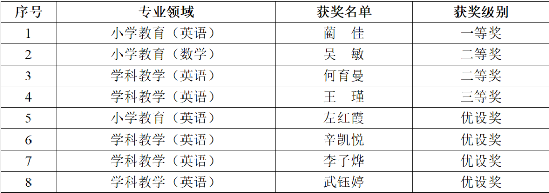 学科教学(英语)、小学教育专业领域研究生表现优异,共获得全国一等奖1项,二等奖2项、三等奖1项,实现了教育硕士研究生在全国教学技能大赛获奖的零突破。