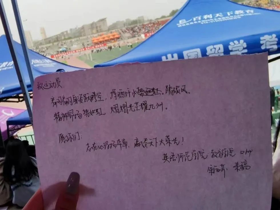 作为学院新媒体中心的一员,我也担任了学院运动会志愿者,看到运动员冲向终点的时候,我也不禁欢呼鼓掌。我用文字记录下看到的点滴瞬间,想以此鼓舞每一位同学。我看到英师学子为运动员加油助威,用心凝聚团体力量:我看到其他志愿者奔走在操场,耐心守护运动员的安全。