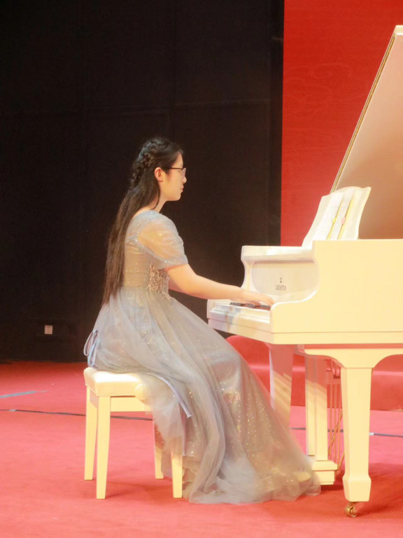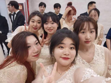 师生合唱团成员盛装出席,身着长裙礼服和西装,伴随着婉转柔长的钢琴声,以一首《不忘初心》和一首《有我》展现出了英语师范学院·鸭奈飞