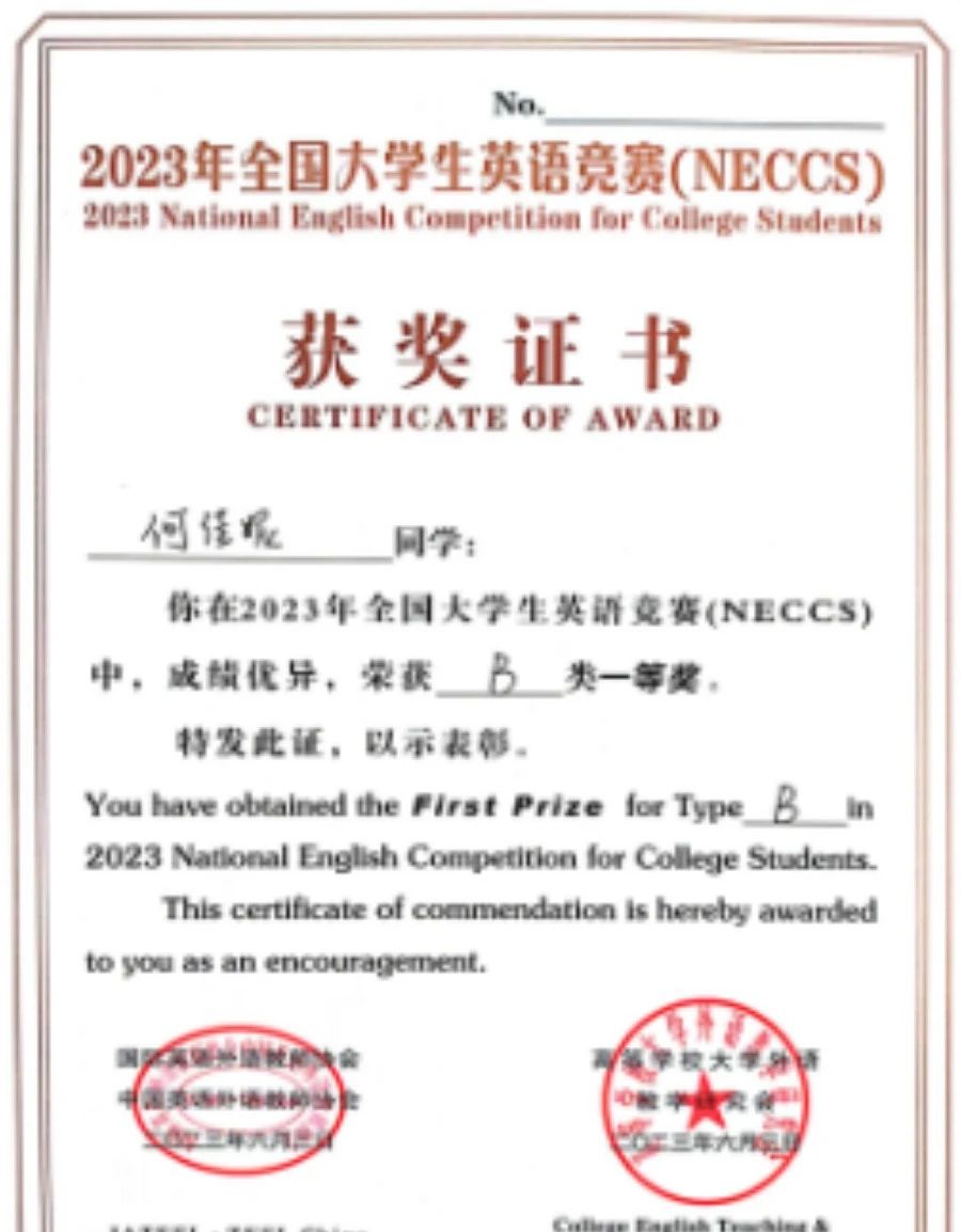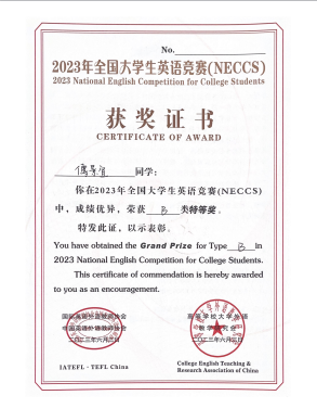 积极组织同学们参加,朱倧汉、曲延春、何佳妮、张博深、傅景宜等同学荣获佳绩。2023年,傅景宜、何佳妮同其他西外学子一同参加全国大学生英语竞赛省赛,分别获得特等奖和一等奖。