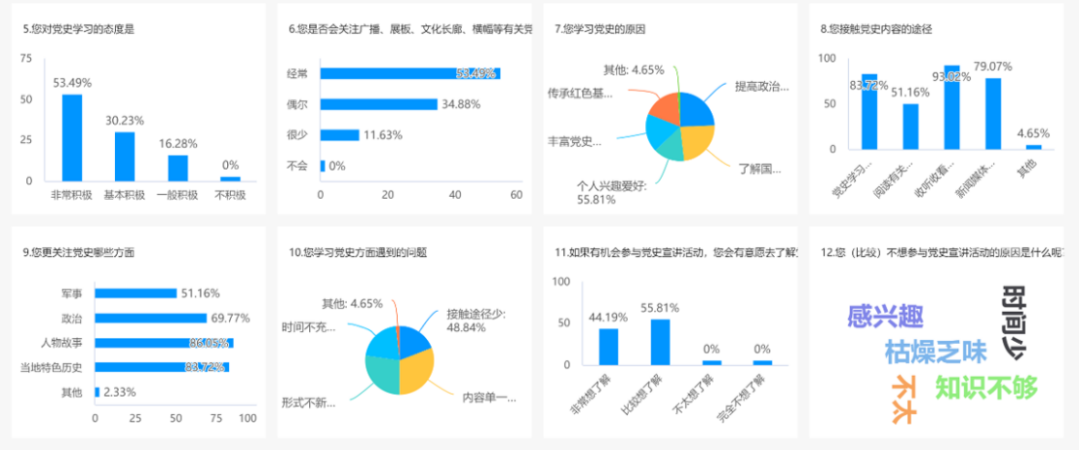 通过走访调研,项目团队成员发现,大众群体对党史学习教育普遍持有积极地态度,这为团队开展思政教育提供了良好的基础条件。约80%的调研对象会关注广播、展板以及文化长廊等,为更有效地开展理论宣讲提供了关于加强平台与场所建设的思路。大部分的调研对象学习党史更多的兴趣点在于当地特色历史和人物故事等趣味性强、贴切生活的内容,这充分说明地方党史是党史的有机组成部分和特色所在,也是增强党史学习教育感染力和代入感的重要载体。同时,大家对于双语讲解也十分感兴趣,并表示愿意投入时间了解双语讲解,认为这种途径不仅丰富自己关于党的知识,更从另一方面提高了自己的外语能力。此外,调查结果还表明,大部分调研对象认为造成党史理论学习效果不佳的原因在于党史材料本身的生涩难懂以及枯燥性,这要求团队在之后的党史学习教育实践活动中,不断完善创新,提高宣讲材料的灵活性和趣味性,吸引更多受众的兴趣。