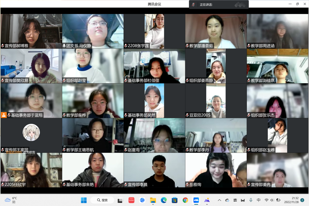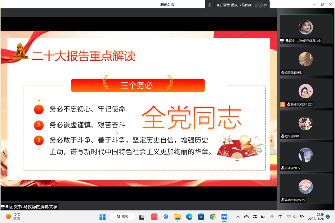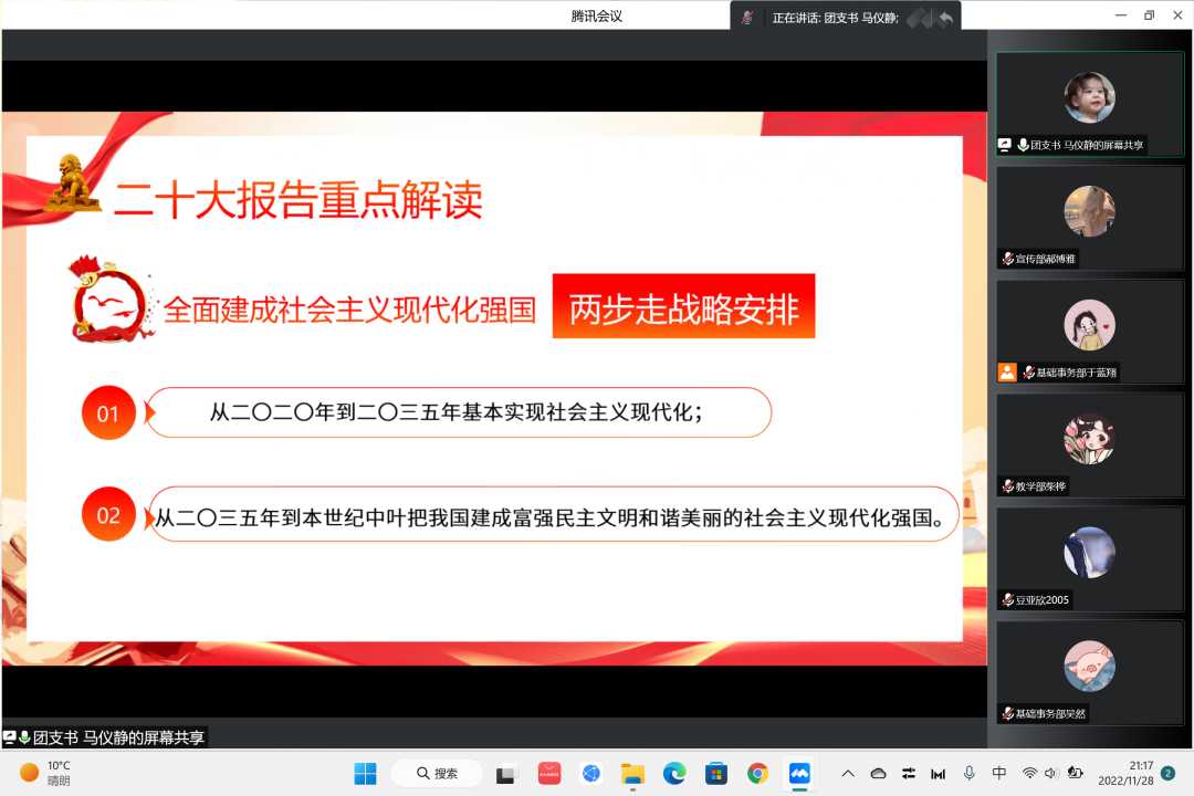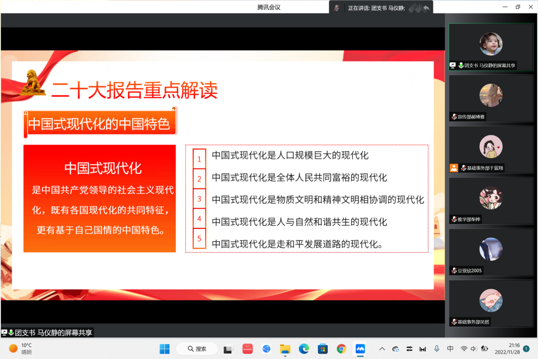 本次活动由团支书马仪静同学主持,活动的主题是“青春心向党,奋进新征程”。本次活动重点对二十大报告进行深入研习,目的是使各位同学对二十大的精神更加了解,加深各位同学对二十大报告的思想认识。