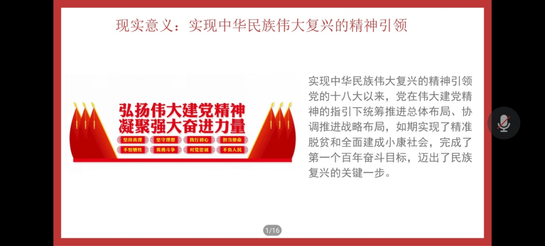 奋进新征程、建功新时代,必须大力弘扬伟大建党精神。党的二十大报告全文贯穿着伟大建党精神的深刻意蕴,大会主题就包括“弘扬伟大建党精神”。贾天宇同学从伟大建党精神的发源、三十二字内涵及现实意义出发,引导同学们弘扬伟大建党精神、凝聚强大奋进力量。