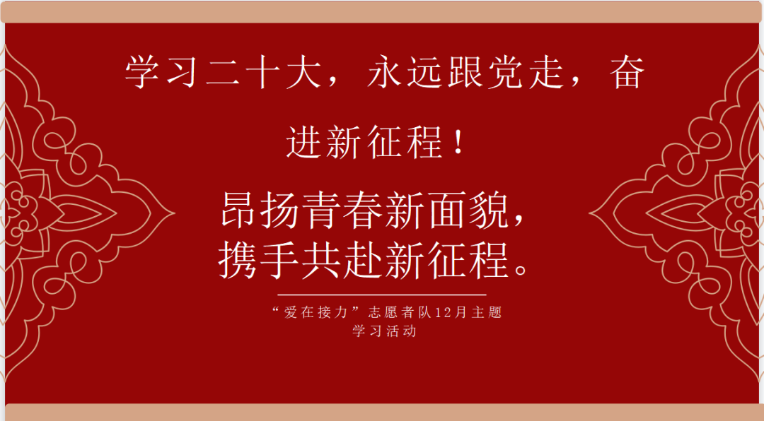 为深入学习二十大精神,“爱在接力”志愿者队于12月13日开展了“昂扬青春新面貌,携手共赴新征程”线上主题团日活动。