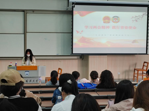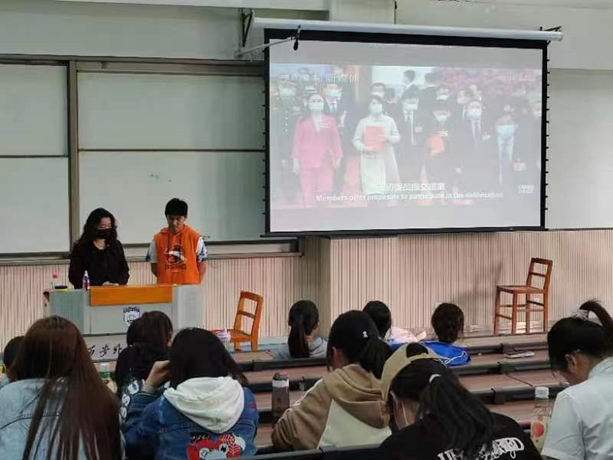 本次集中学习由罗靖婷与何解正冉同学双语为同学们科普两会知识,进行时政学习并凝练出两会精神的具体内涵——铸牢中华民族共同体意识、坚持以人民为中心、真抓实干的奋斗。在讲解过程中,同学们认真聆听,获益匪浅。