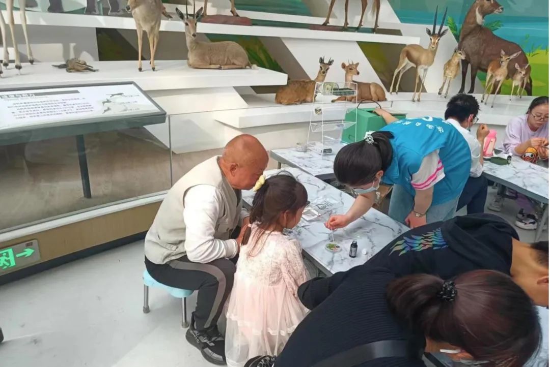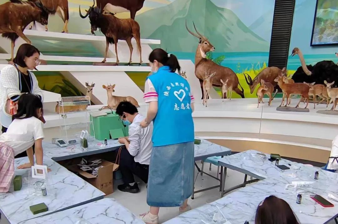 在一楼大厅,负责保护“秦岭四宝”动物标本的志愿者关注标本的同时提醒小朋友勿以手触摸误食防腐物质;负责制作标本的志愿者细心协助小朋友共同完成精致的标本;负责保护其他主题类标本的志愿者则认真站岗,耐心回答游客问题。