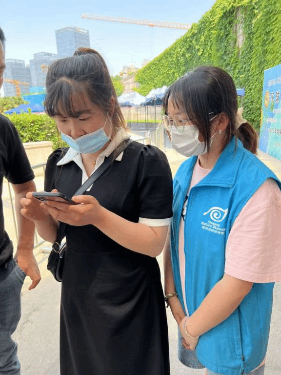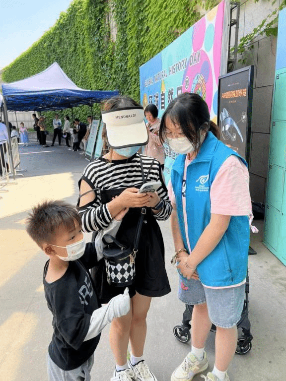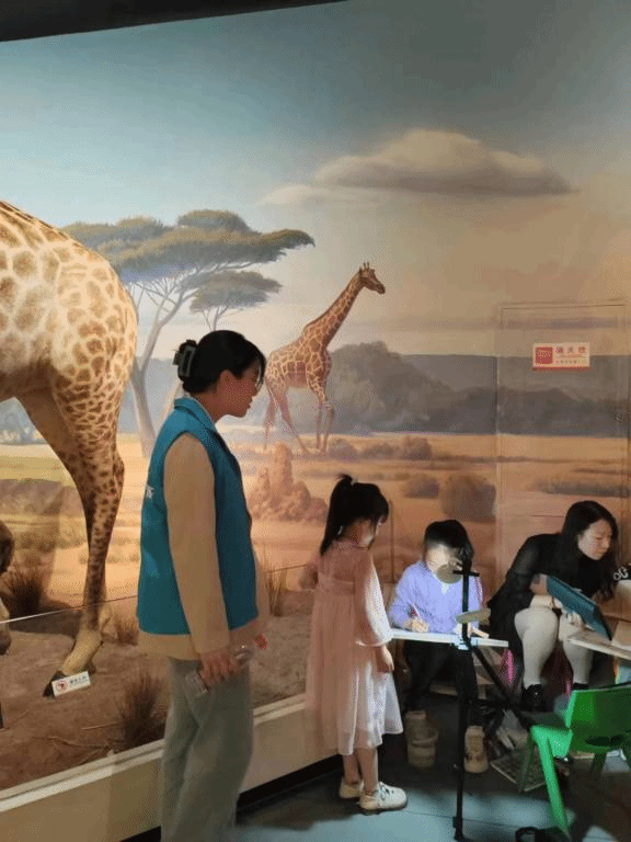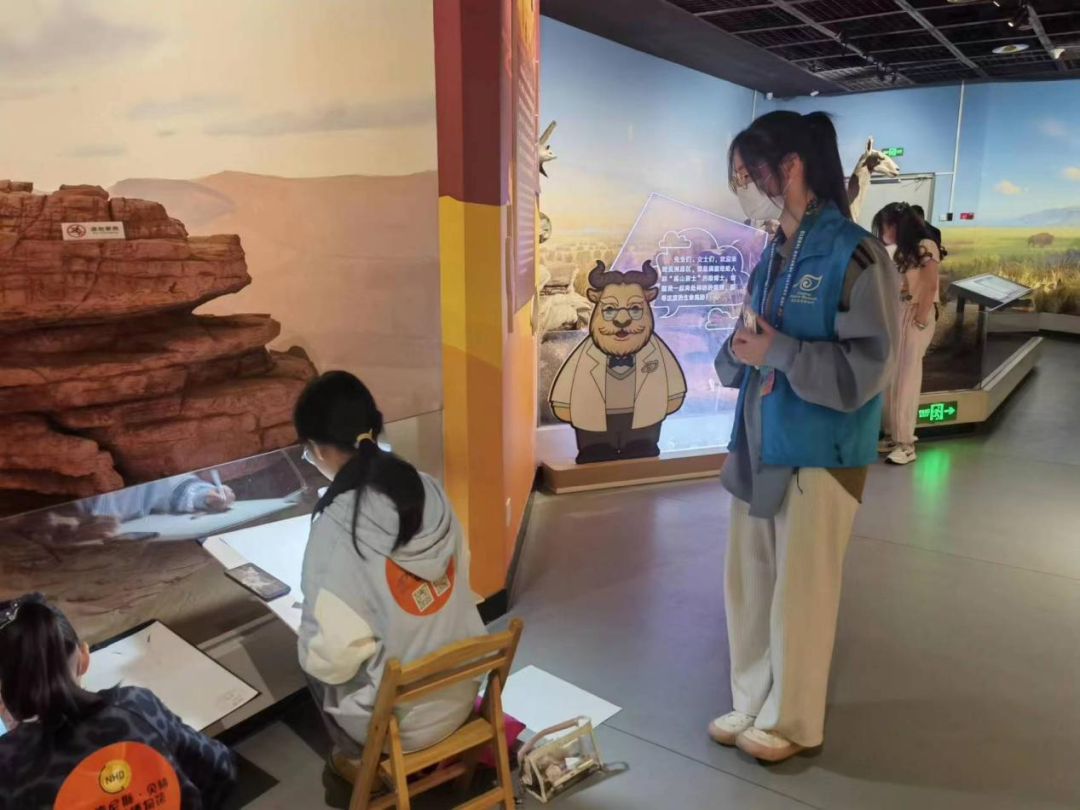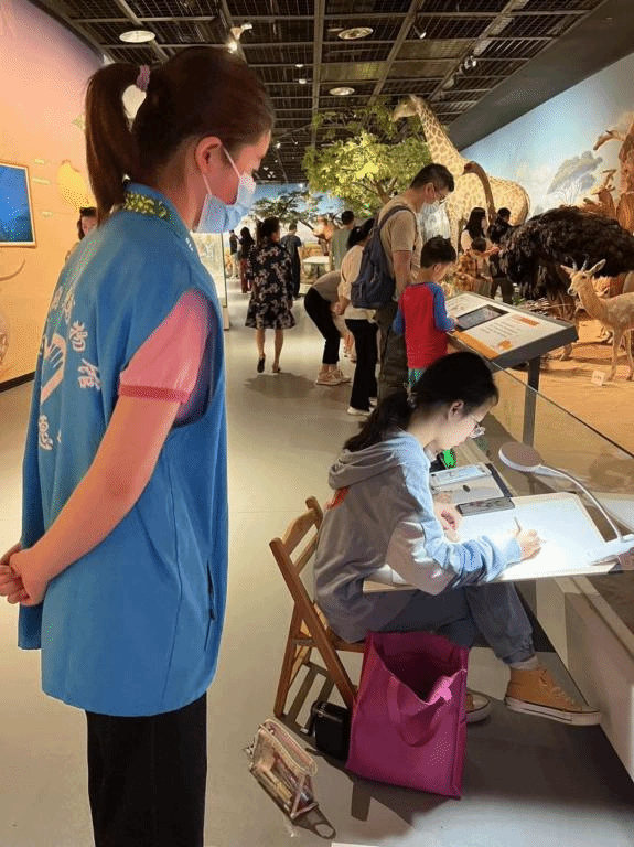 恰逢环球自然日绘画比赛决赛的召开,贝林馆的志愿者除规范游客文明参观和为游客答疑解难外,还负责监督比赛的有序进行。自然馆的志愿者们则被单独分到不同的展区,负责保护博物馆内的展品,引导游客的参展路线,帮助展区内的游客更好地参展。展馆内的灯光明暗不齐,但鲜亮的蓝色背心总能出现在游客们需要的地方。