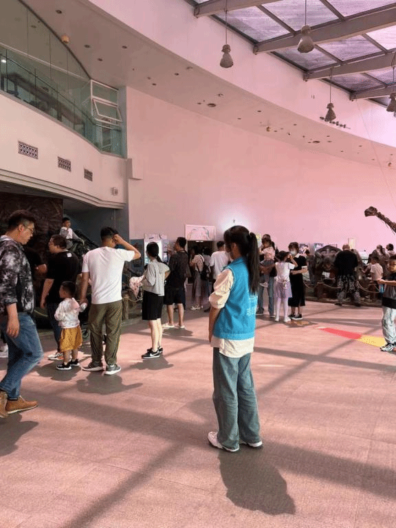 志愿者们于八点半到达陕西自然博物馆,在博物馆负责人的领导下,穿上蓝色马甲熟悉分组负责的场域,开展为期一天的志愿活动。志愿者们被划分成两组,分别负责贝林馆与自然馆。