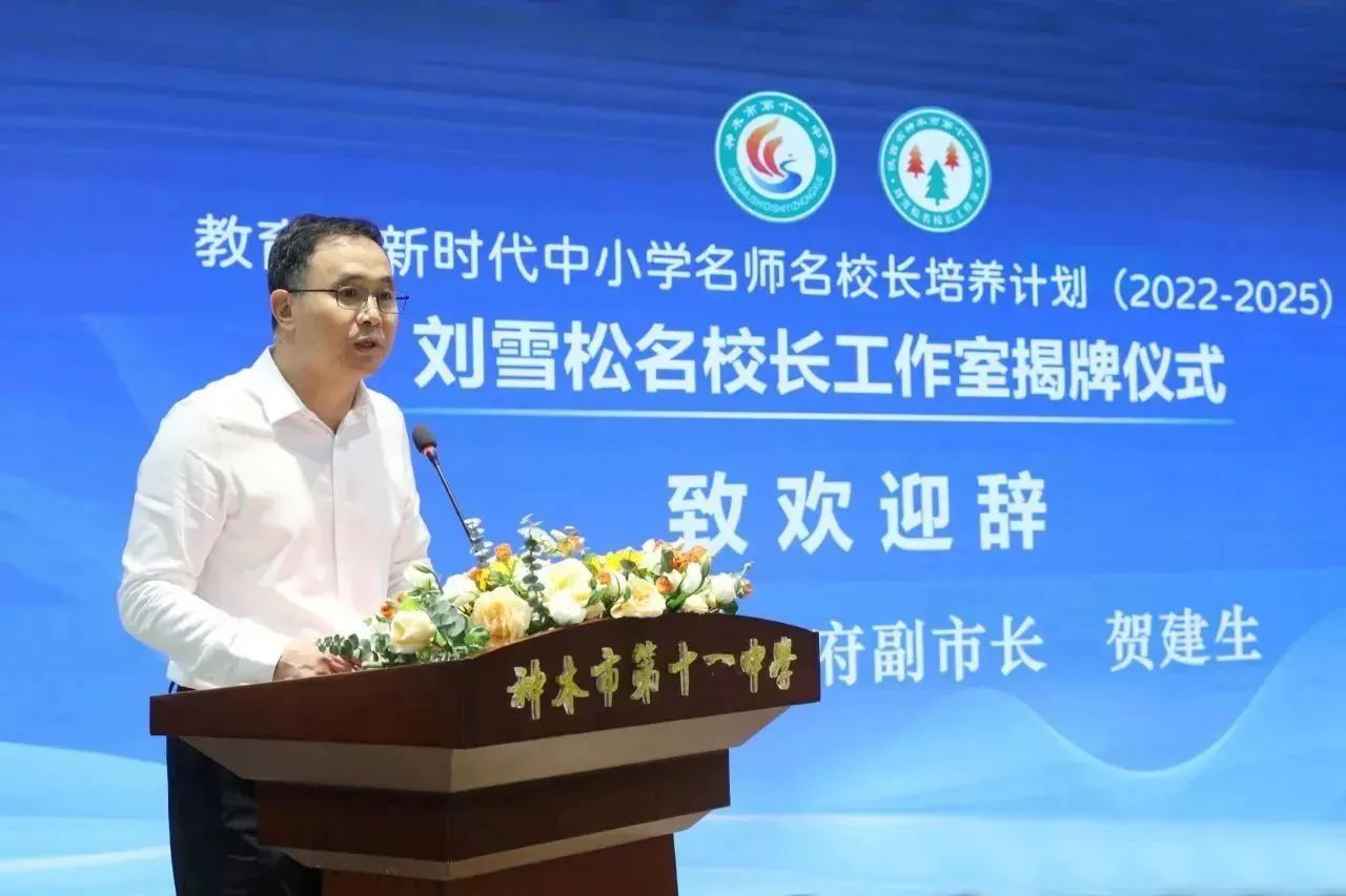 神木市人民政府副市长贺建生在仪式上致欢迎辞,祝贺“刘雪松名校长工作室”揭牌,以及近年来神木市以“办好人民满意的教育”为目标,持续加大教育投入力度,强化校长队伍建设方面所做的工作与成效。