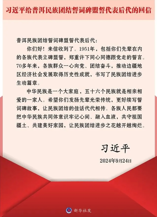 近日,中共中央总书记、国家主席、中央军委主席习近平给普洱民族团结誓词碑盟誓代表后代回信,对他们予以亲切勉励并提出殷切希望。